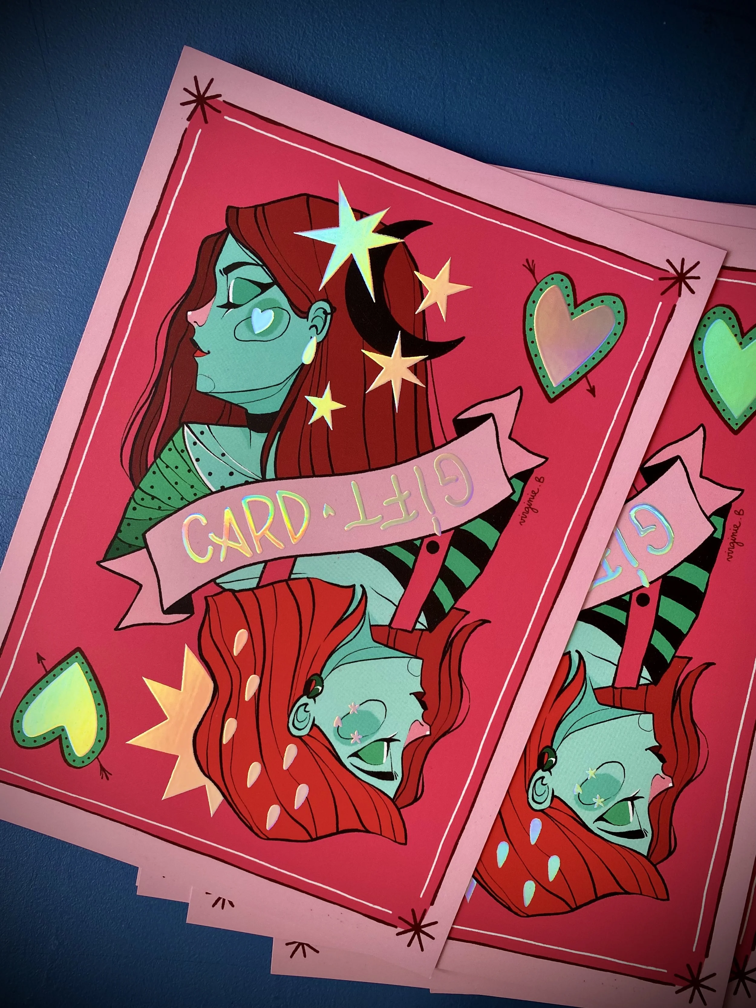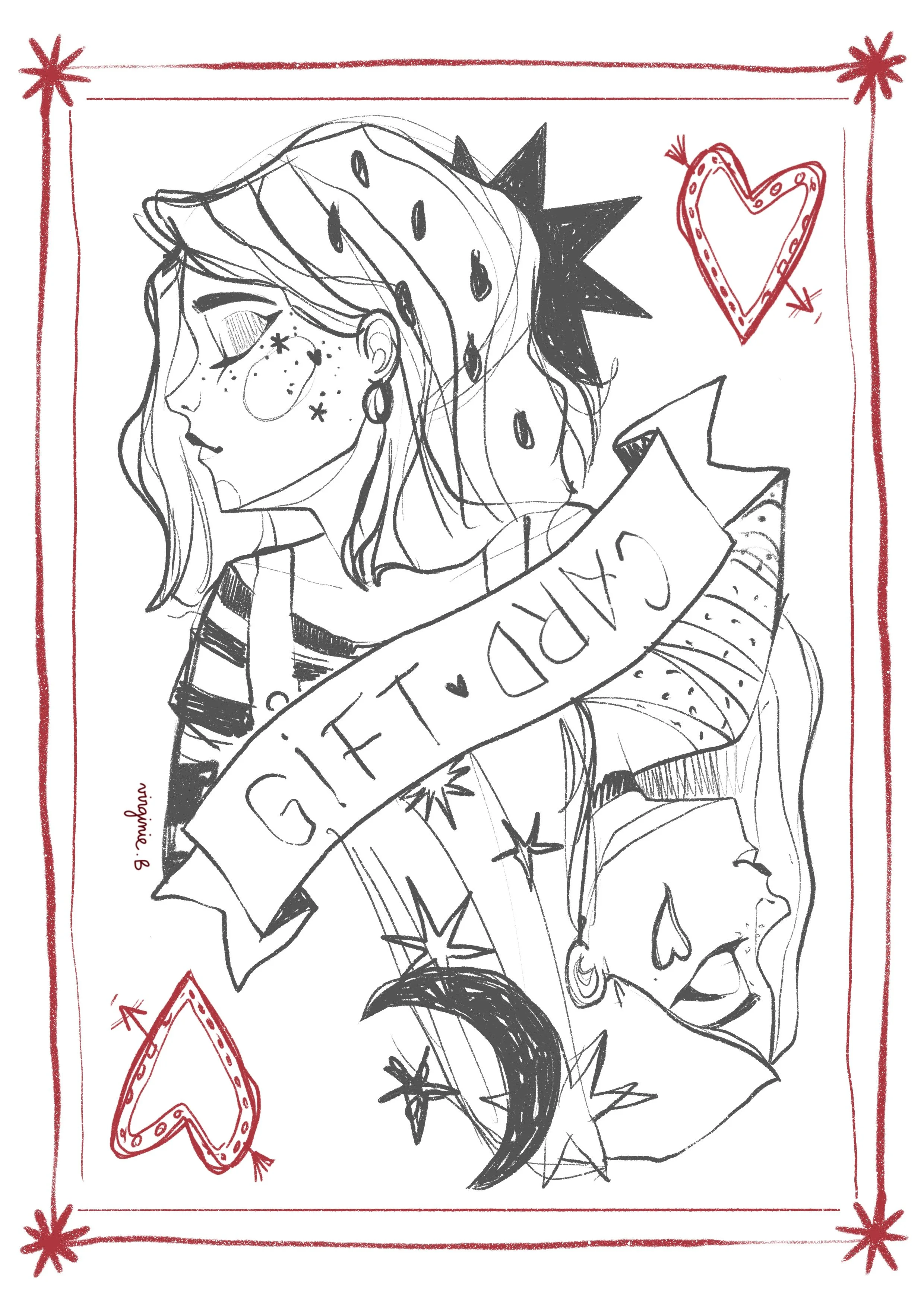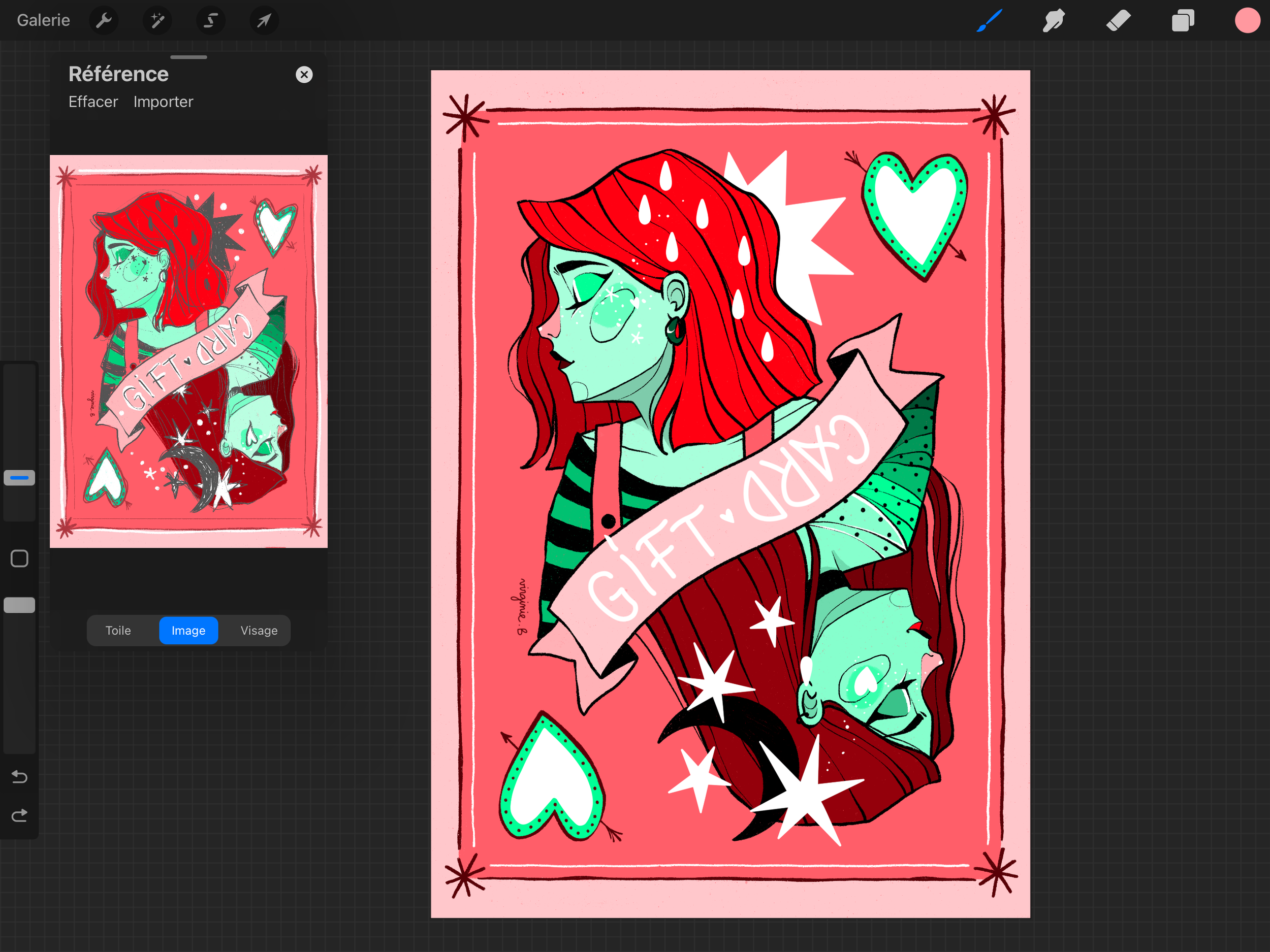 Voici donc les différentes étapes de la création de la nouvelle illustration ! Je suis partie sur le principe visuel d’une carte à jouer avec son double sens.