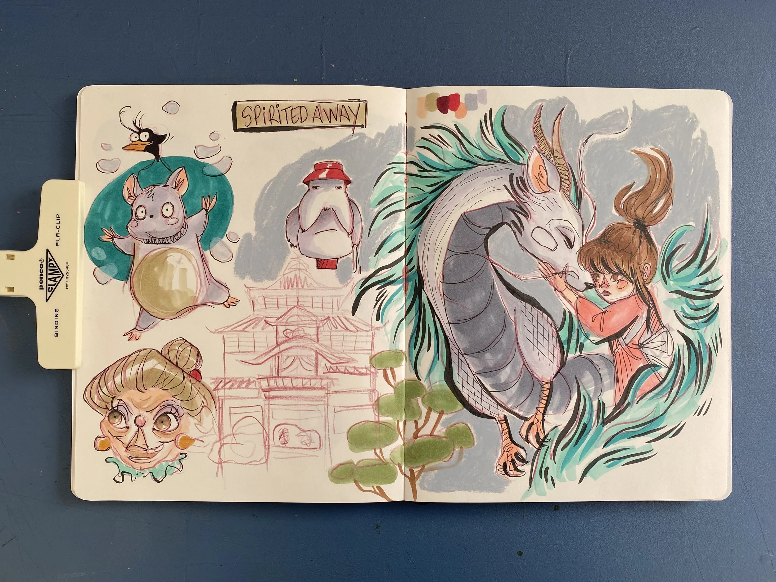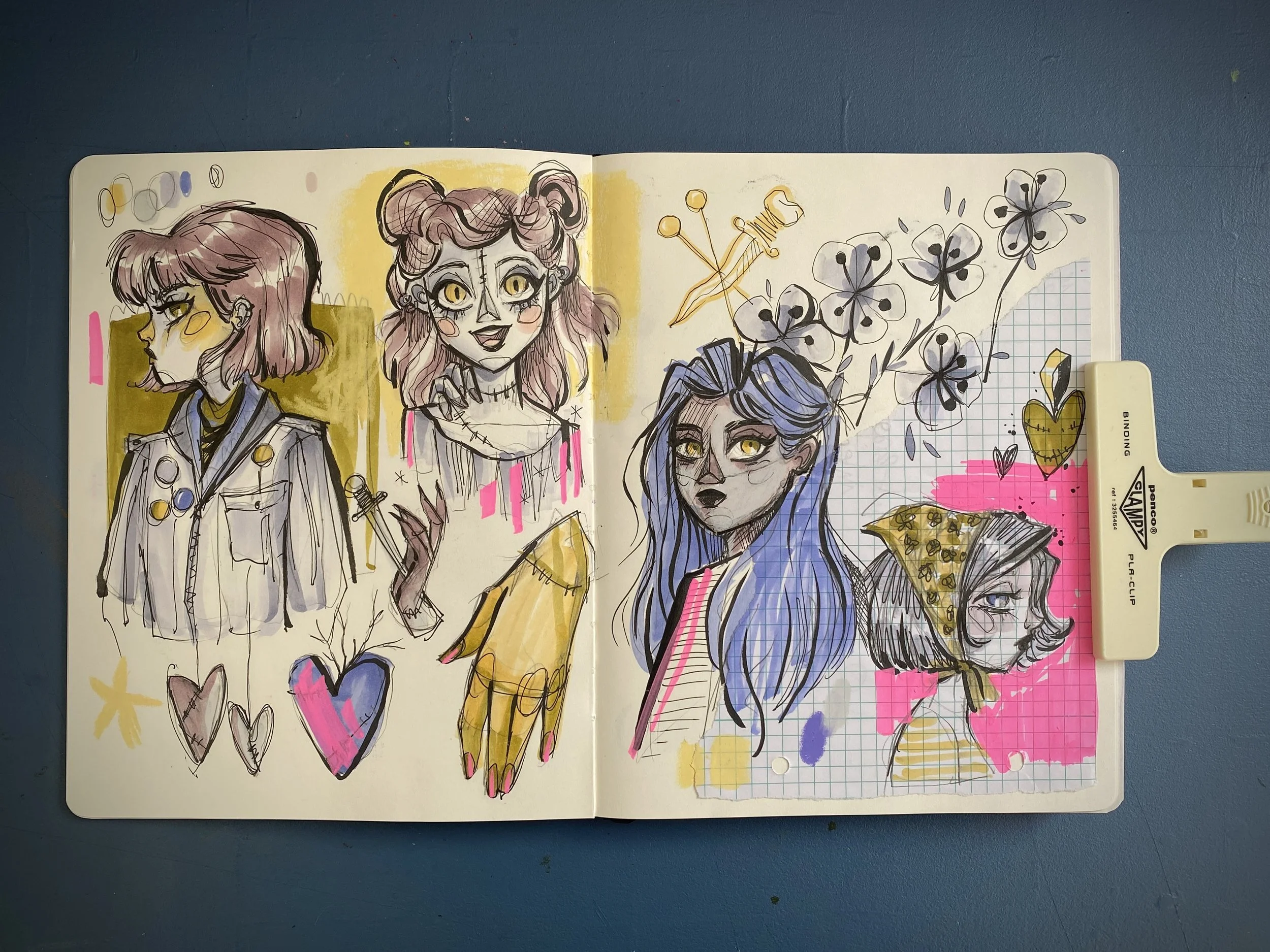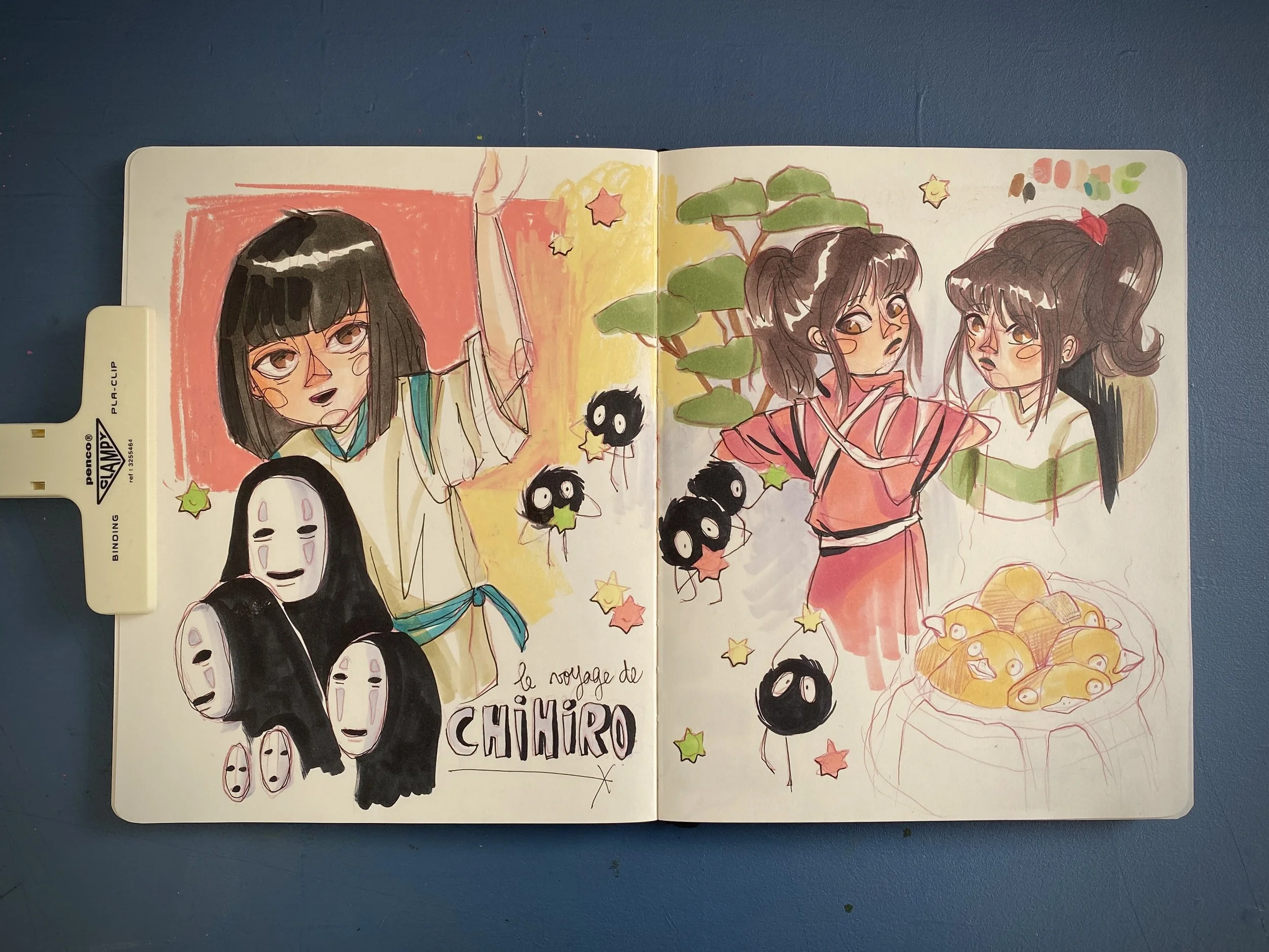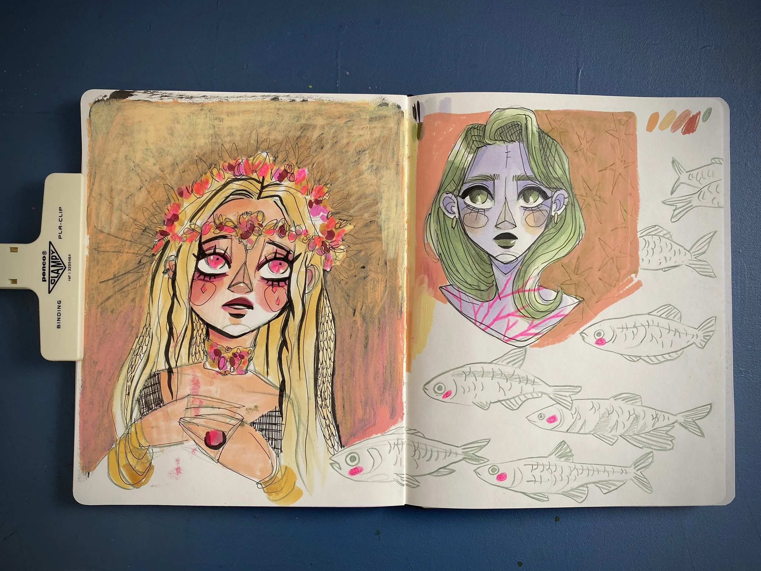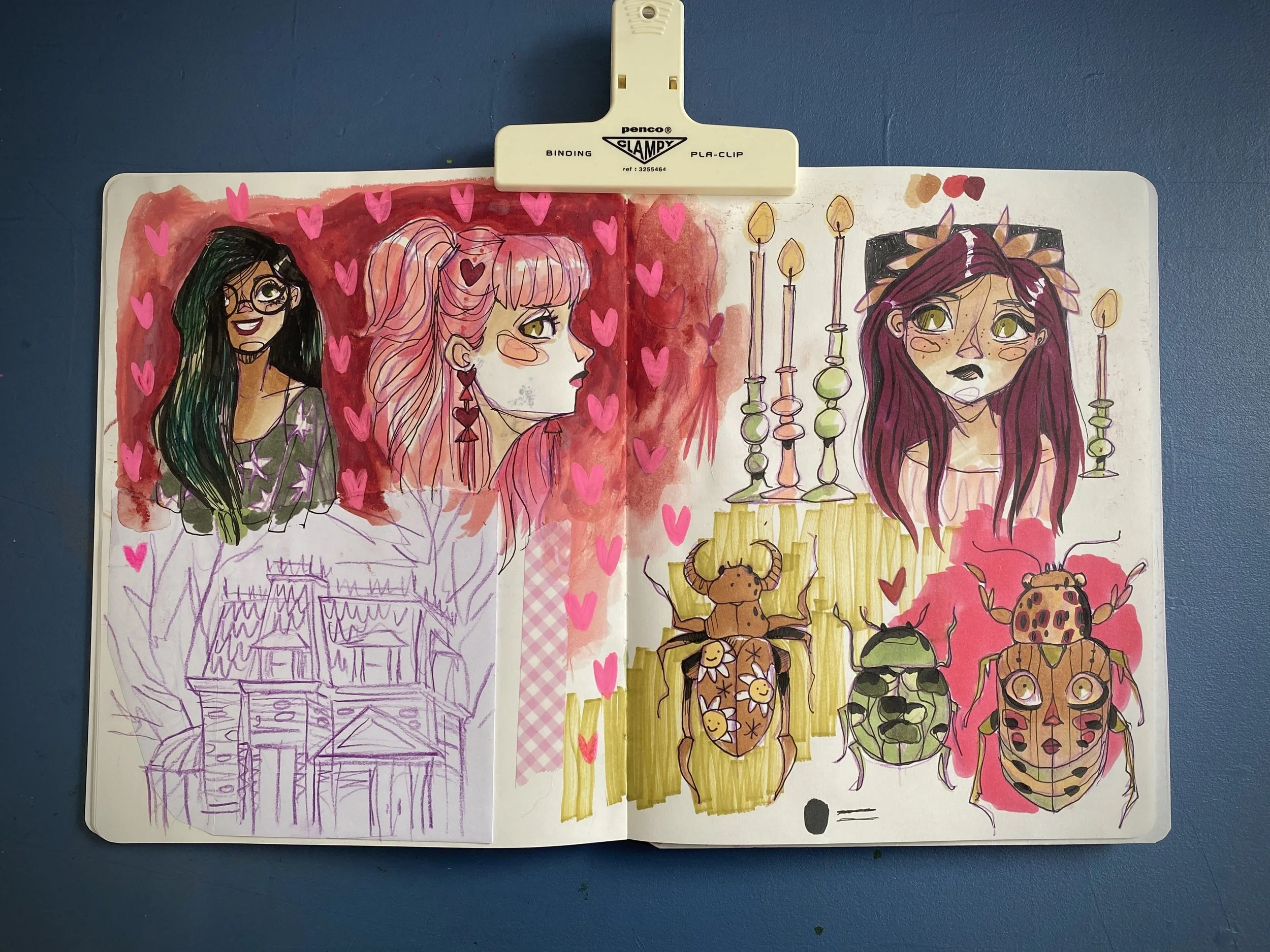 Aujourd’hui, je vous montre quelques unes des dernières pages de mon carnet de croquis/recherches. Un carnet dans lequel je m’amuse avec la couleur, les techniques et où je ne cherche pas à faire les choses parfaitement bien. C’est plutôt pour faire de l’expérimentation et des essais sur certaines idées ou associations.